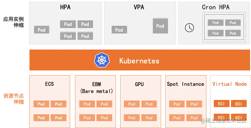 结合 ACK 弹性节点池提供的多种弹性伸缩能力,对 GPU 在资源节点数和运行任务实例数两层都可以按需自动伸缩。触发弹性的条件既有 GPU 的资源使用指标,也支持用户自定义指标。伸缩节点类型支持普通 EGS 实例,也支持 ECI 实例,Spot 实例等。