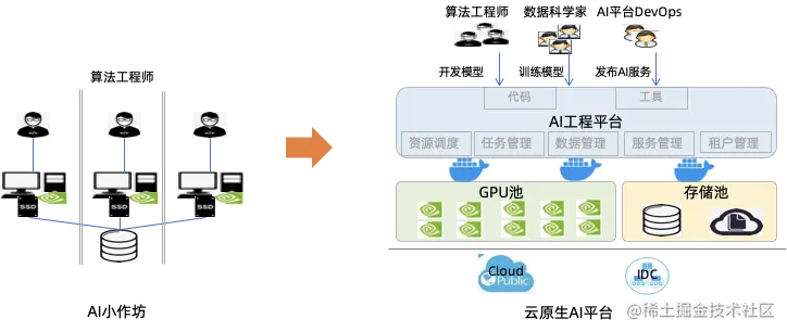 在初期,用户利用 Kubernetes,Kubeflow,nvidia-docker 可以快速搭建 GPU 集群,以标准接口访问存储服务,自动实现 AI 作业调度和 GPU 资源分配,训练好的模型可以部署在集群中,这样基本实现了 AI 开发和生产流程。紧接着,用户对生产效率有了更高要求,也遇到更多问题。比如 GPU 利用率低,分布式训练扩展性差,作业无法弹性伸缩,训练数据访问慢,缺少数据集、模型和任务管理,无法方便获取实时日志、监控、可视化,模型发布缺乏质量和性能验证,上线后缺少服务化运维和治理手段,Kubernetes 和容器使用门槛高,用户体验不符合数据科学家的使用习惯,团队协作和共享困难,经常出现资源争抢,甚至数据安全问题等等。