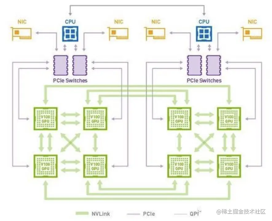 随着深度学习模型复杂度和训练数据量提升,多 GPU 卡分布式训练已经很非常普遍。对于使用梯度下降优化的算法,多 GPU 卡之间需要频繁传输数据,数据通信带宽往往成为限制 GPU 计算性能的瓶颈。
