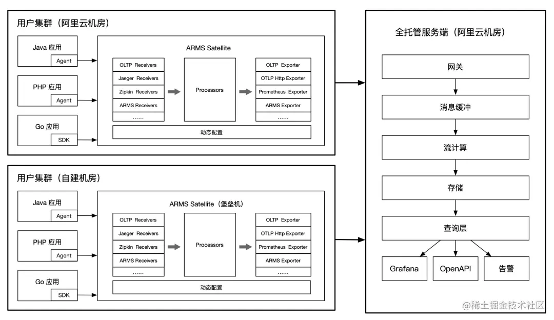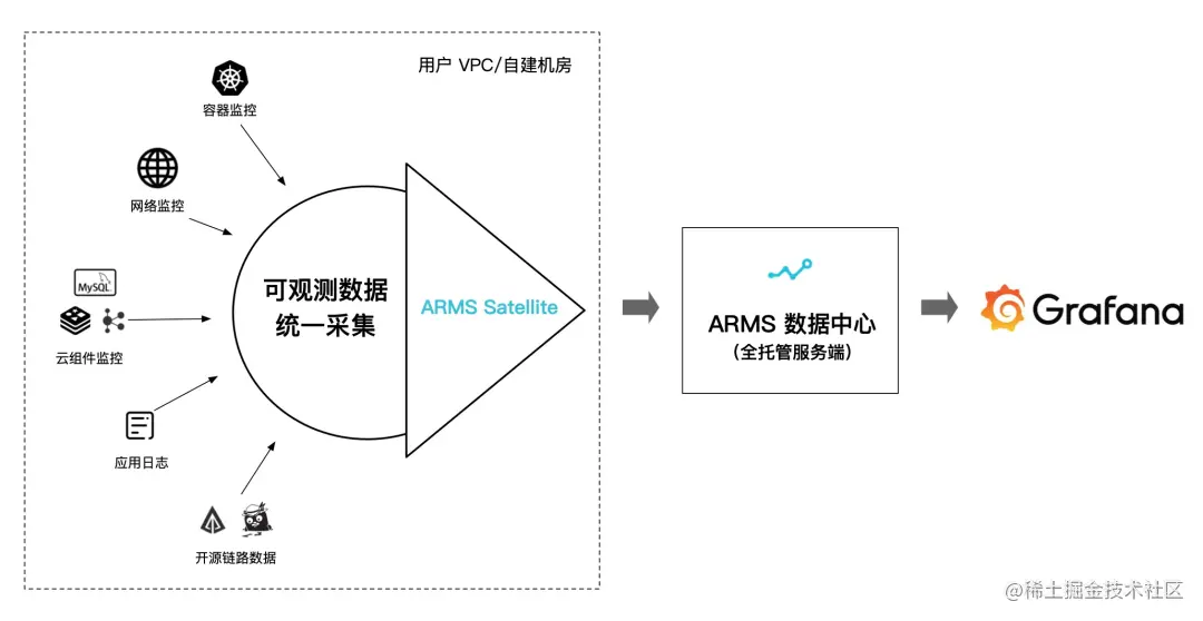 近两年 OpenTelemetry 和 SkyWalking 等社区都在大力研发边缘采集与计算 Satellite 方案。ARMS for OpenTelemetry Satellite(简称ARMS Satellite)是一套基于 OpenTelemetry Collector 开发的可观测数据(Traces、Metrics、Logs)边缘侧统一采集与处理平台,具备安全、可靠、易用等特性,适合生产环境接入。