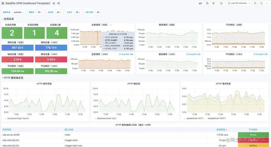 ARMS Satellite 支持 Trace 数据无损统计,对接收到的 Trace 数据自动进行本地预聚合,得到精准的统计结果后再执行链路采样上报,这样在降低网络开销和持久化存储成本的同时,保证了应用监控与告警指标的准确性。默认集成的 Satellite APM Dashboard 如下图所示。