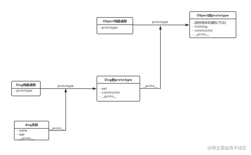 明明没有在 dog 实例里手动定义 eat 方法和 toString 方法,它们还是被成功地调用了。这是因为当我试图访问一个 JavaScript 实例的属性 / 方法时,它首先搜索这个实例本身;当发现实例没有定义对应的属性 / 方法时,它会转而去搜索实例的原型对象;如果原型对象中也搜索不到,它就去搜索原型对象的原型对象,这个搜索的轨迹,就叫做原型链。