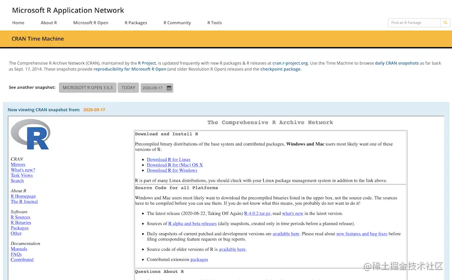 MRAN快照帮助我们用一个日期作为 "索引 "来锁定软件包的版本。例如,运行: