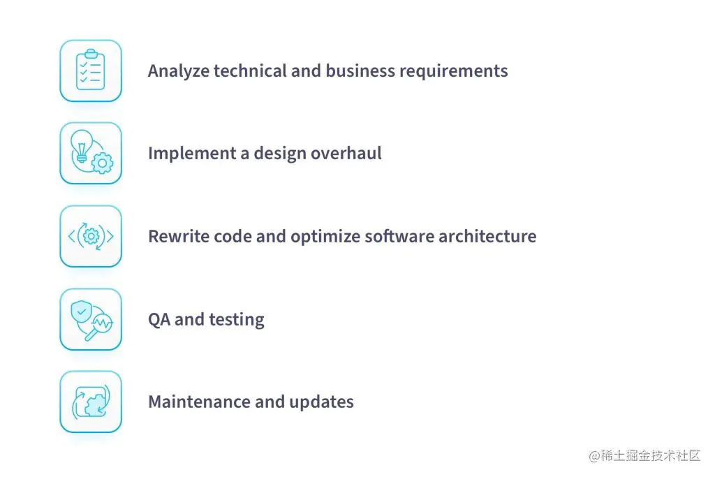 整个过程的最终费用范围是由整个过程和技术/业务的具体情况形成的。但最终的价格是与从头开始创建一个应用程序的价格差不多。完整的转换将花费同样多的时间,而所有的设计和代码检修程序都必须由全职的设计师和开发人员以类似于建立一个新的软件架构的方式进行。