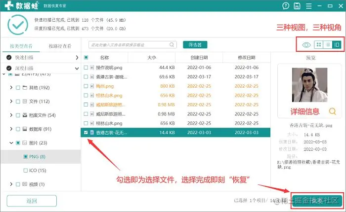 - 第3步:在扫描出来的结果中找到自己丢失的文件,随后可通过切换文件的视图来查看详情信息,选择好文件后确认无误,即可开始“恢复”。