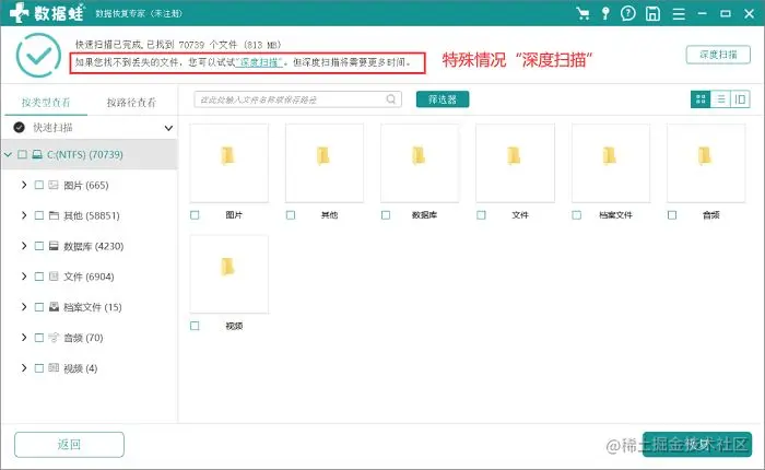 - 注:如果你的文件在扫描出来的结果中并未找到,或是只找到了一部分的话,那么可以进行“深度扫描”;
