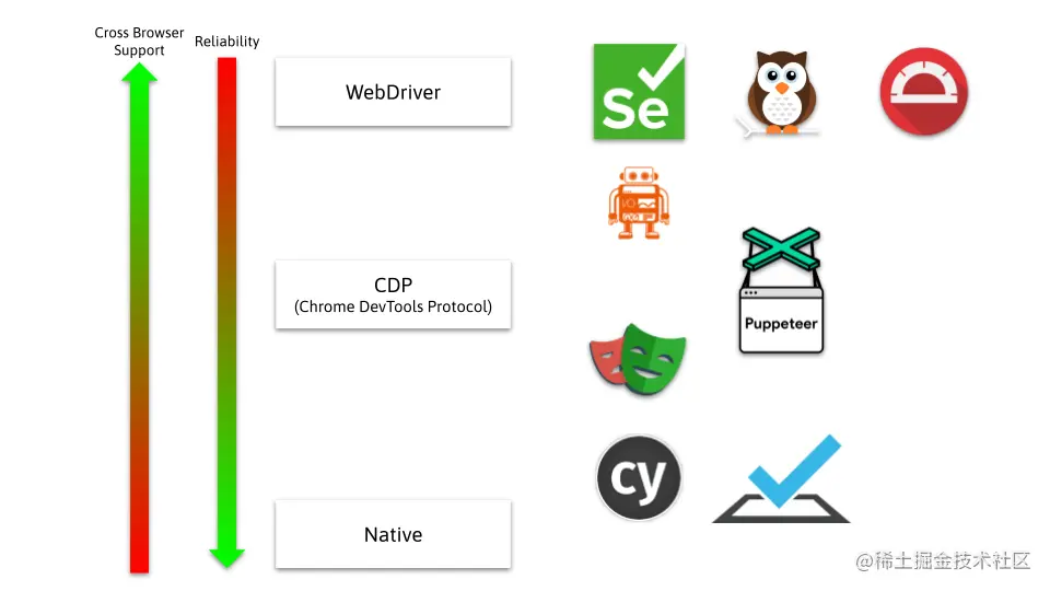 Cypress属于哪个类别?Cypress也依赖于CDP。与Puppeteer相比,Cypress只使用CDP来管理测试。测试本身根本不使用CDP,而是直接在浏览器中运行。在测试和浏览器之间不再有任何一层。测试和应用程序代码是一体的。你的测试代码可以直接访问DOM,而不是通过CDP或WebDriver间接访问。