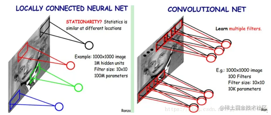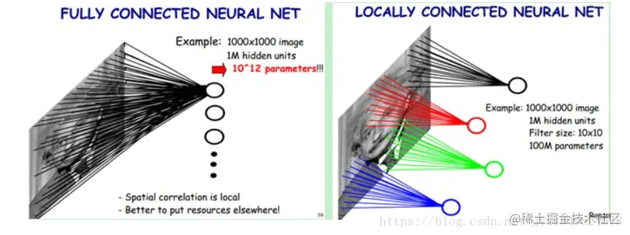 为降低参数数目,采用局部感知野。对局部进行感知,然后在更高层将局部的信息综合起来就得到了全局的信息。网络部分联通思想,也是受启发于生物学中的视觉系统结构。视觉皮层的神经元就是局部接受信息的(即这些神经元只响应某些特定区域的刺激)。如下图:左为全连接,右为局部连接。