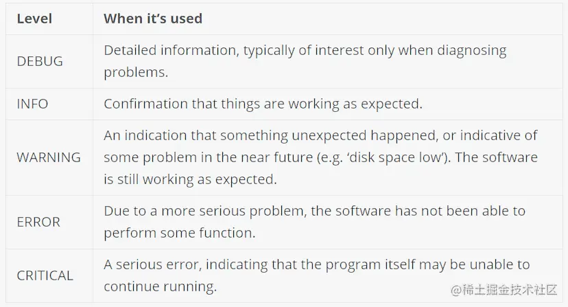 - 注意,日志有一个分层的等级,以隔离不同严重程度的日志。在上面的例子中,级别参数表示被追踪的最小级别,因此被保存到文件中。根据官方指南,这些是不同的日志级别,以及关于何时使用这些级别的一些细节_(按严重程度递增)_。