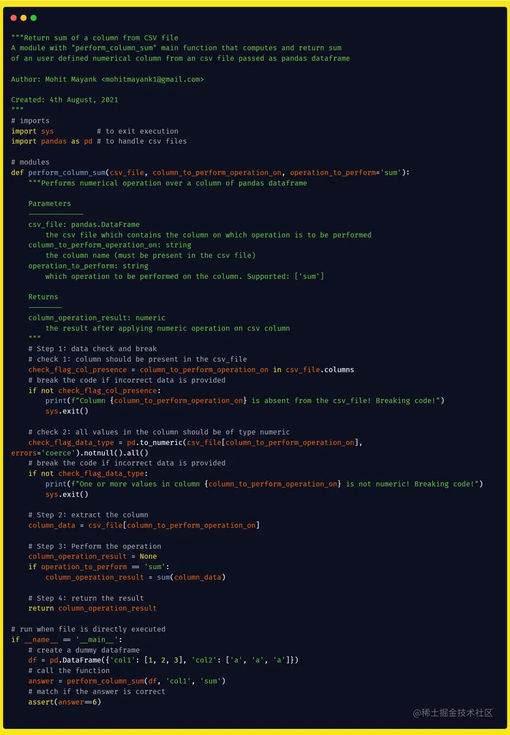 - 最后,在底部,我们可以包括一些关于如何运行代码的例子。在 if __name__ == '__main__' 内包括这些脚本:确保它们只在文件被直接执行时运行(比如 python _csv_column_operations.py)。_所以当你在另一个脚本中说导入该模块时,这些代码不会运行。