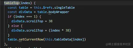 2)编写操作表格滚动的函数,函数传入表格列表的下标。这里已经知道列表高度为38,当传入对应的下标并乘38,赋值给滚动的高度。表格的SetCurentRow为设置表格的高亮方法。