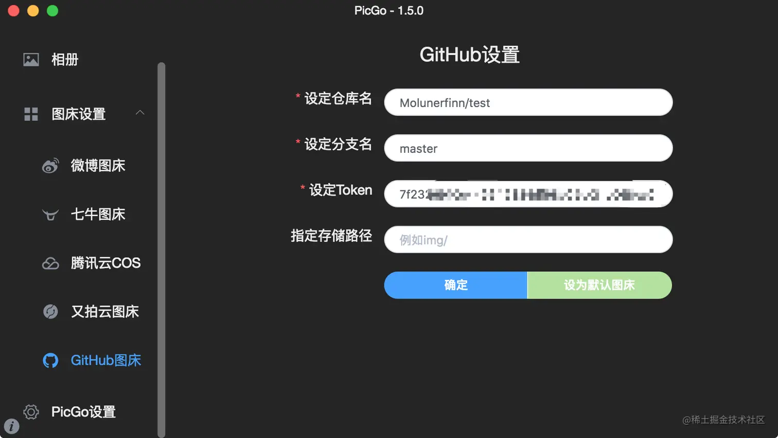 - **注意:**仓库名的格式是用户名/仓库,比如我创建了一个叫做 test 的仓库,在 PicGo 里我要设定的仓库名就是 Molunerfinn/test。