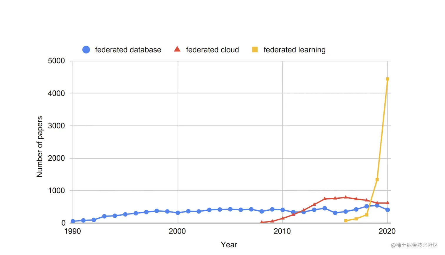 联合学习利用了多个研究领域的技术,如分布式系统、机器学习和隐私。在设备上的数据比存在于服务器上的数据更相关的情况下,FL的应用效果最好。然而,FLS面临各种挑战,如有效性、效率和隐私。FL使多方能够在不交换本地数据的情况下共同训练一个机器学习模型。根据 Li等人的研究,FLS正在各个领域被采用。