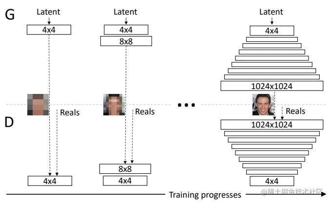 GAN的这种行为的解决方案是通过逐步增加层来训练网络。渐进式GAN是标准GAN的扩展,在处理大图像时将生成器保持在稳定模式,以达到更好的稳定性能。方法包括从非常小的图像开始,如4×4像素的图像,并陆续增加层块,将图像的大小增加到8×8、64×64,直到所需的大小,如下图所示。这使得渐进式GAN能够生成高像素的图像,如1024 x 1024的图像。