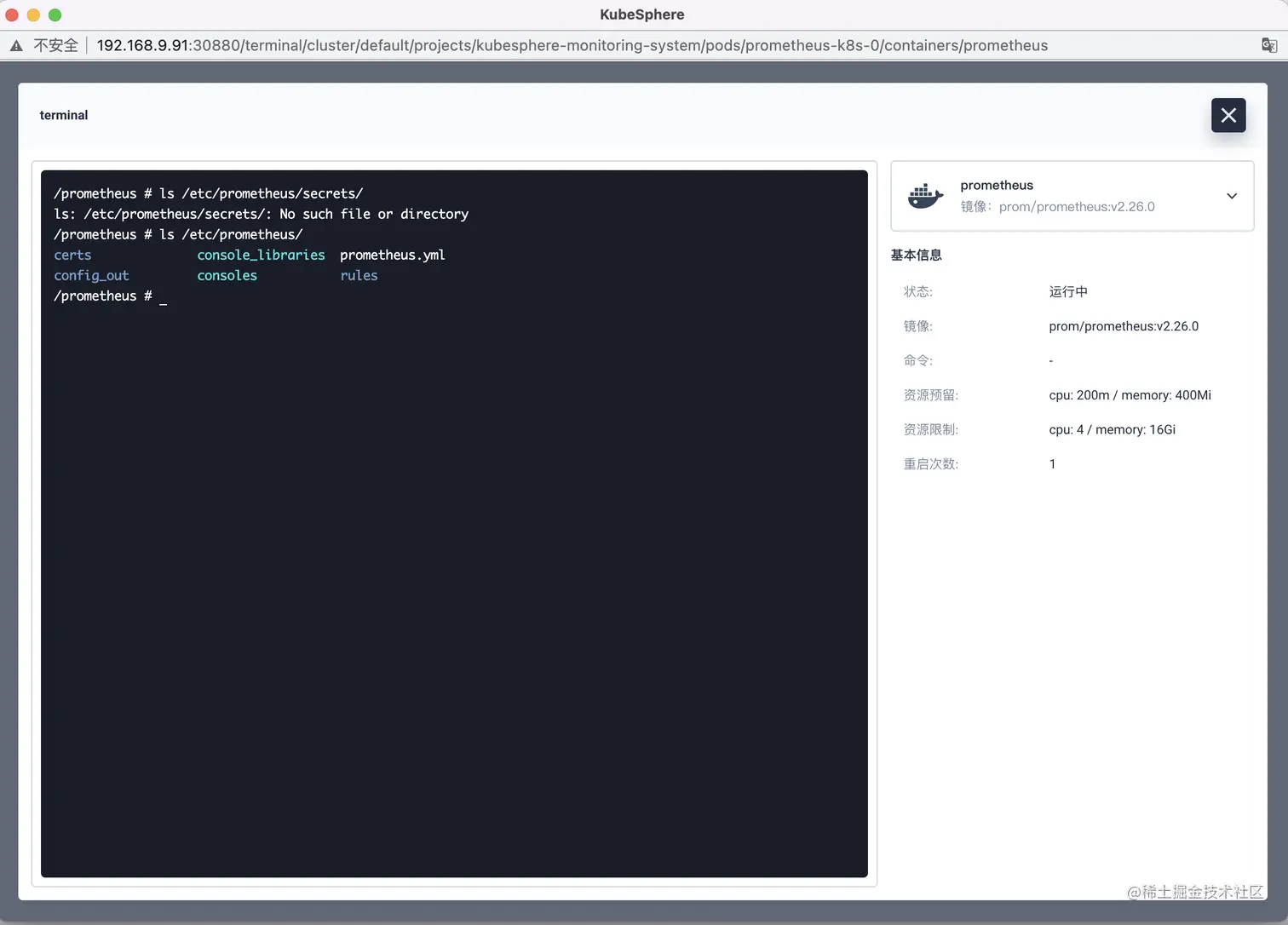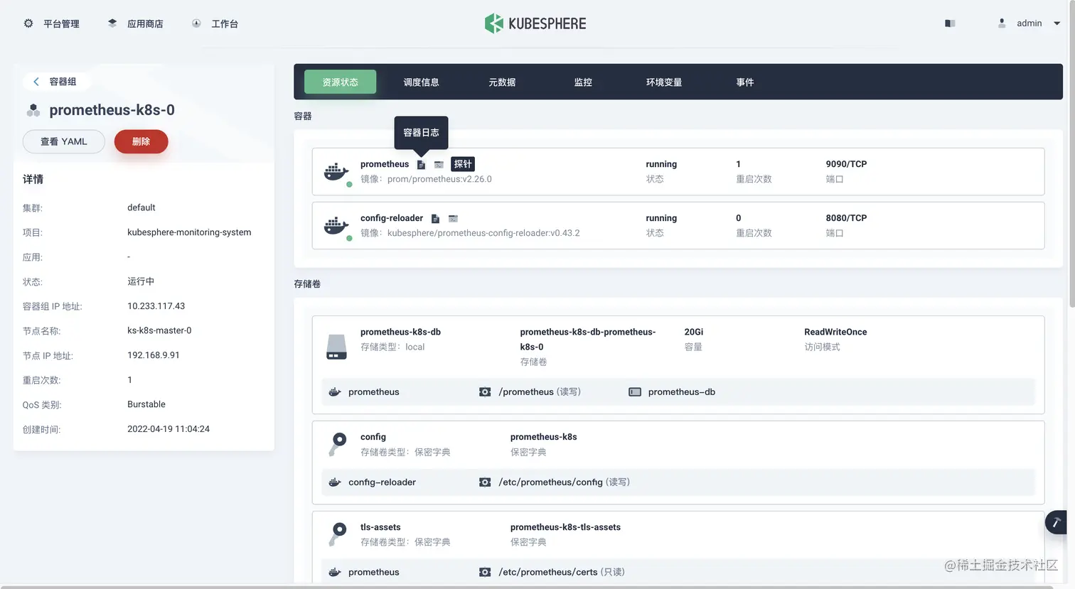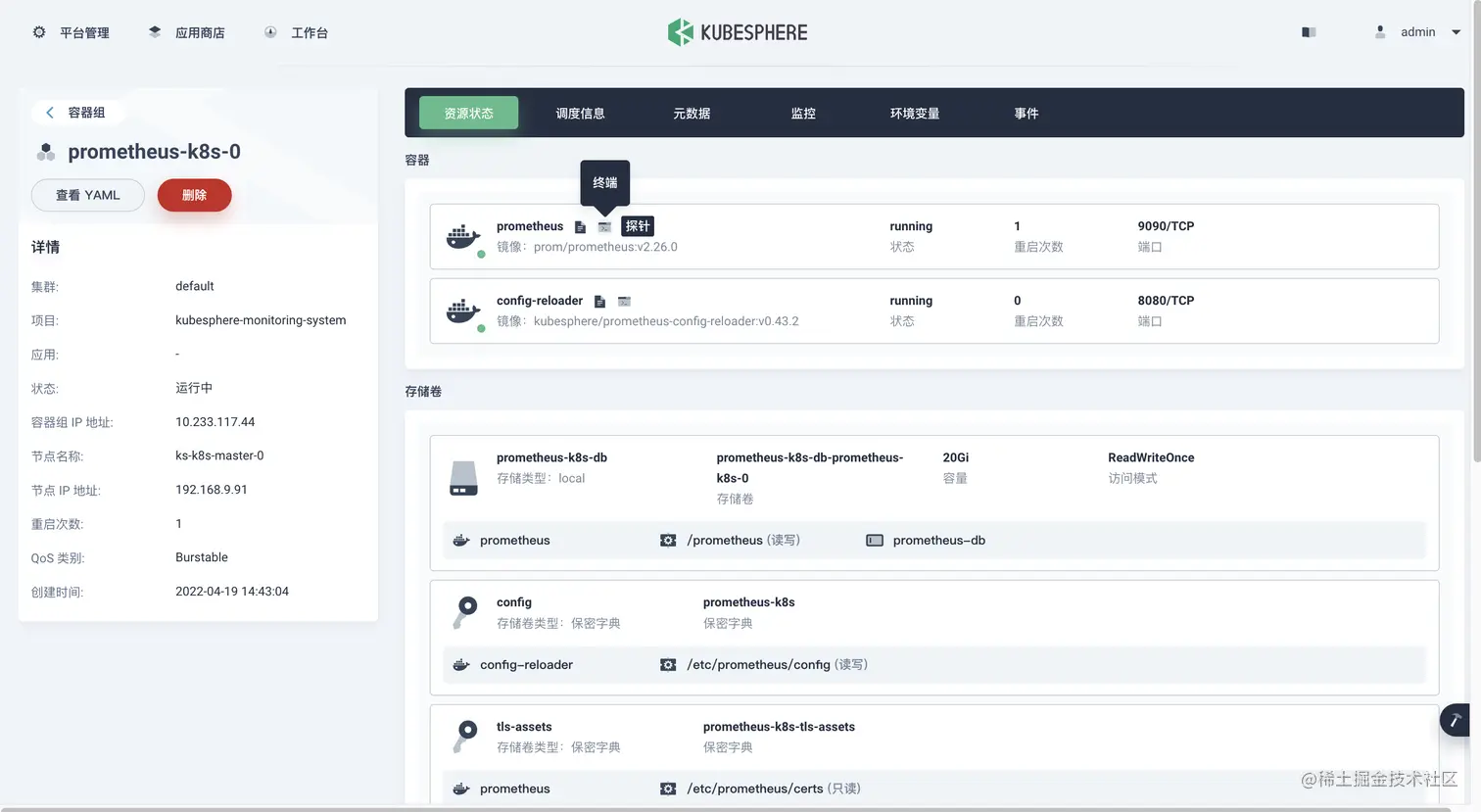点击 prometheus-k8s,进入详细页面,点击容器组中的 prometheus-k8s-0 容器。