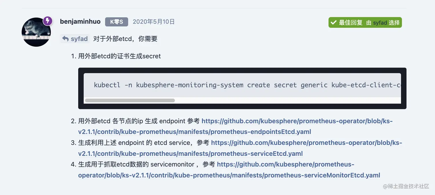 本文源于 KubeSphere 开源社区 8 群里的一个小伙伴 @Jam 提到的 Ectd 监控没有数据,希望我帮忙看一下。本来我也是没有启用 Etcd 监控的,但是既然小伙伴如此信任我提了要求了,那必须安排。所以才有了本文。