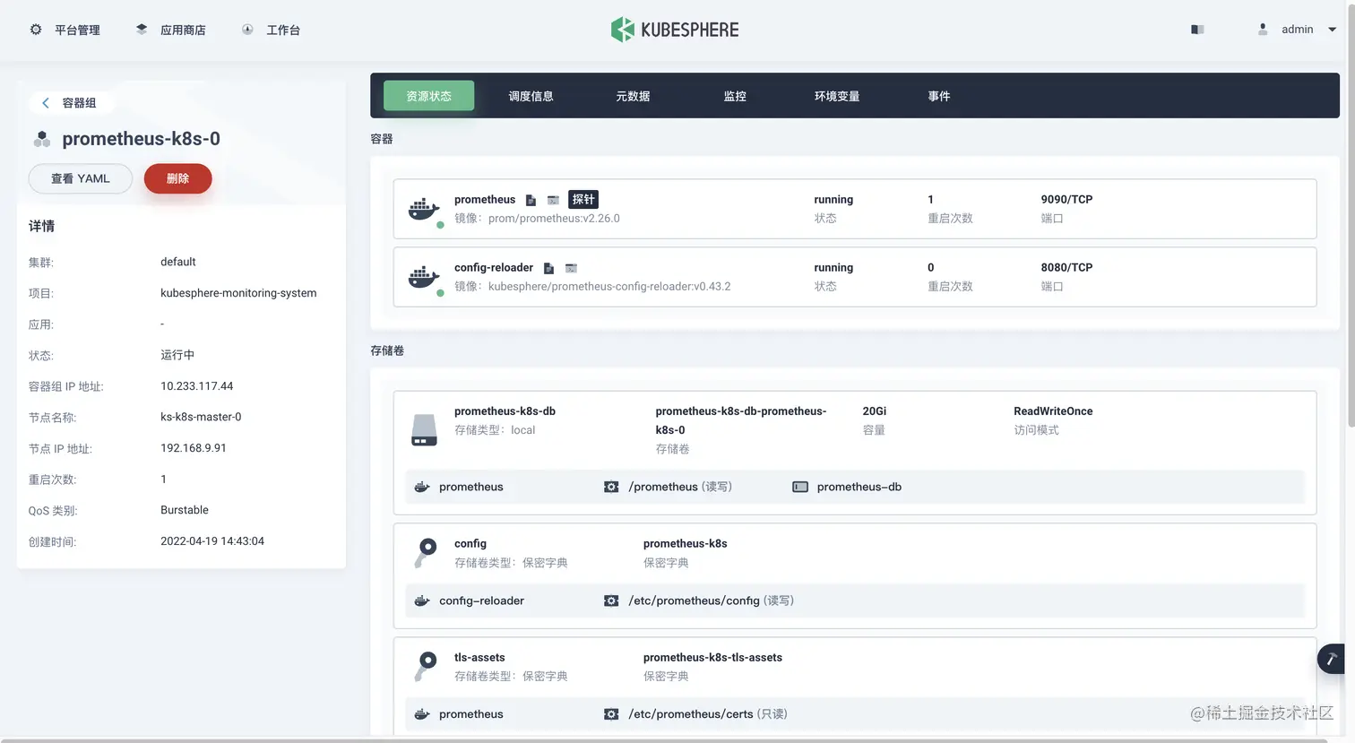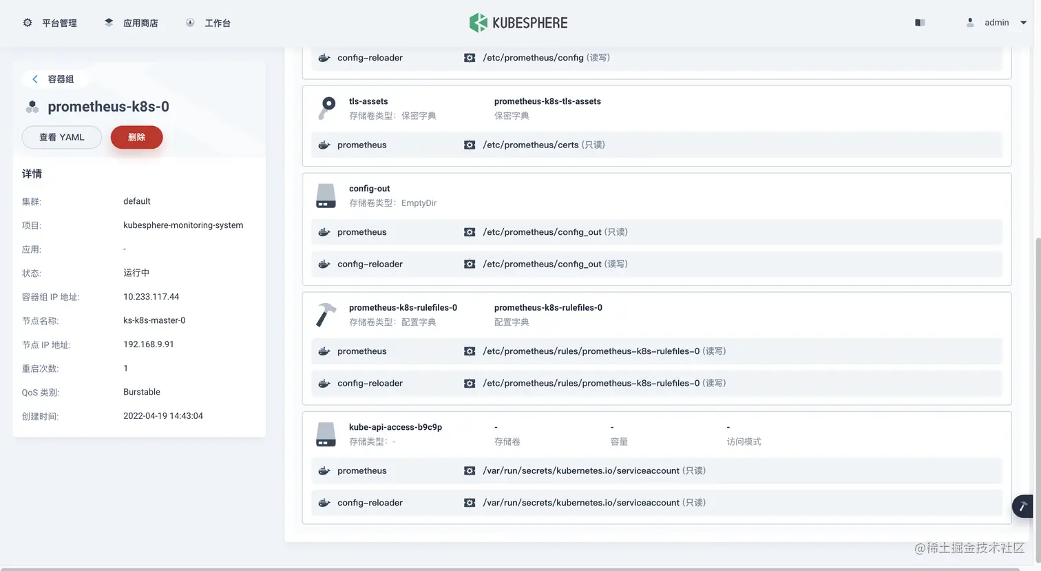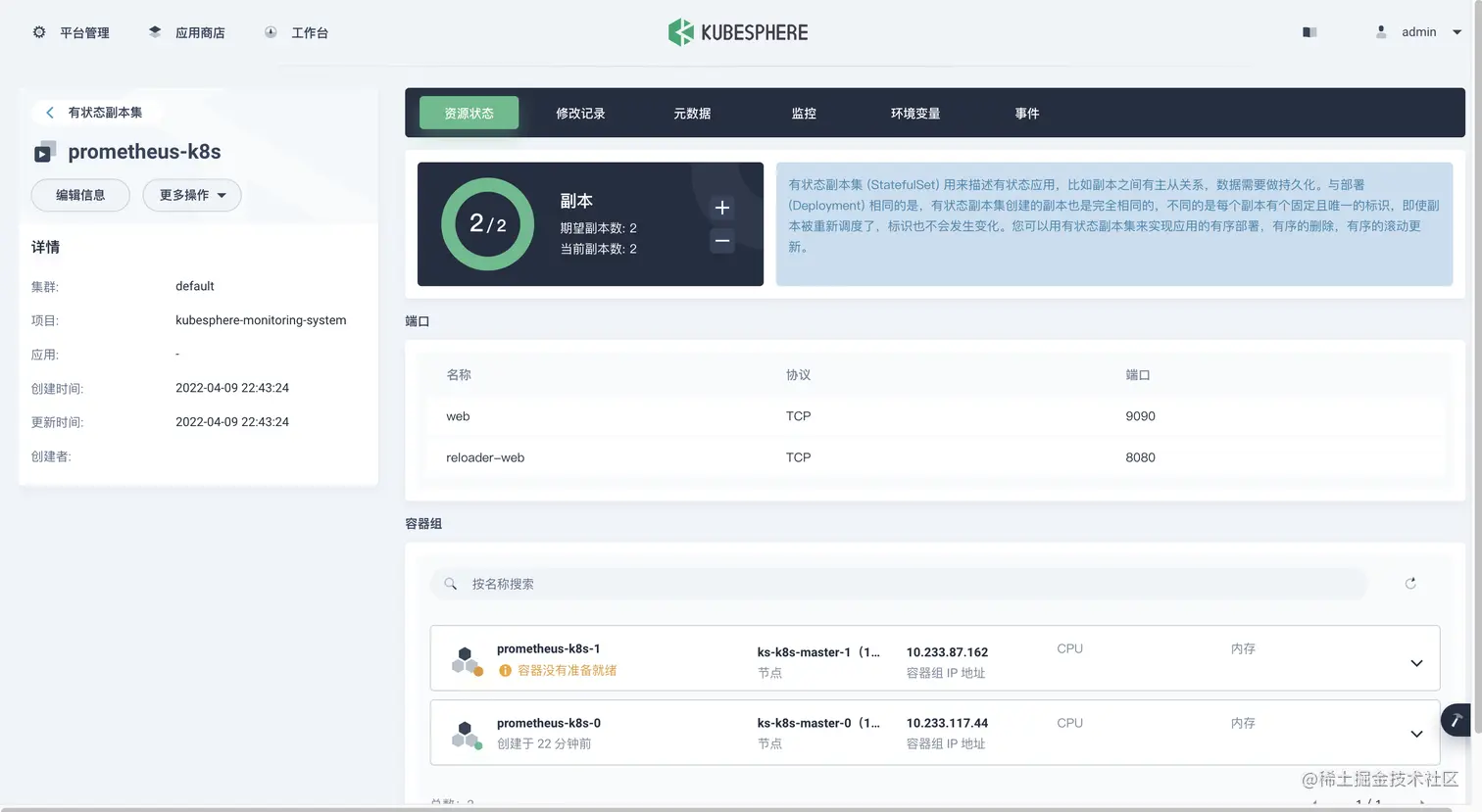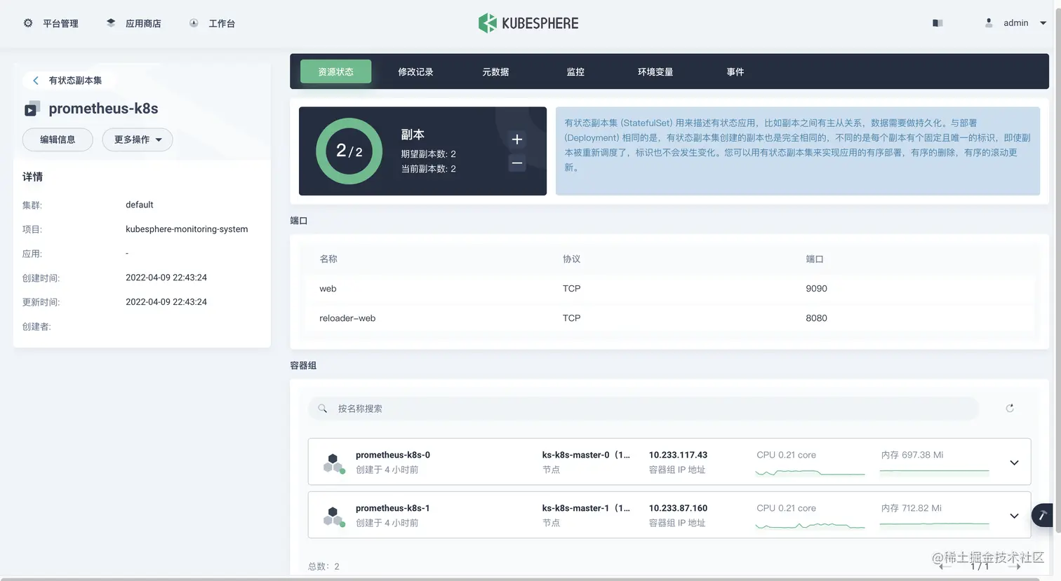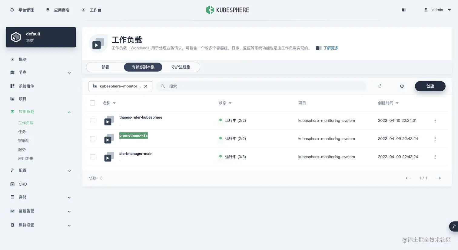 在集群管理->应用负载->工作负载->有状态副本集, 选择 kubesphere-monitoring-system 项目,找到 prometheus-k8s。