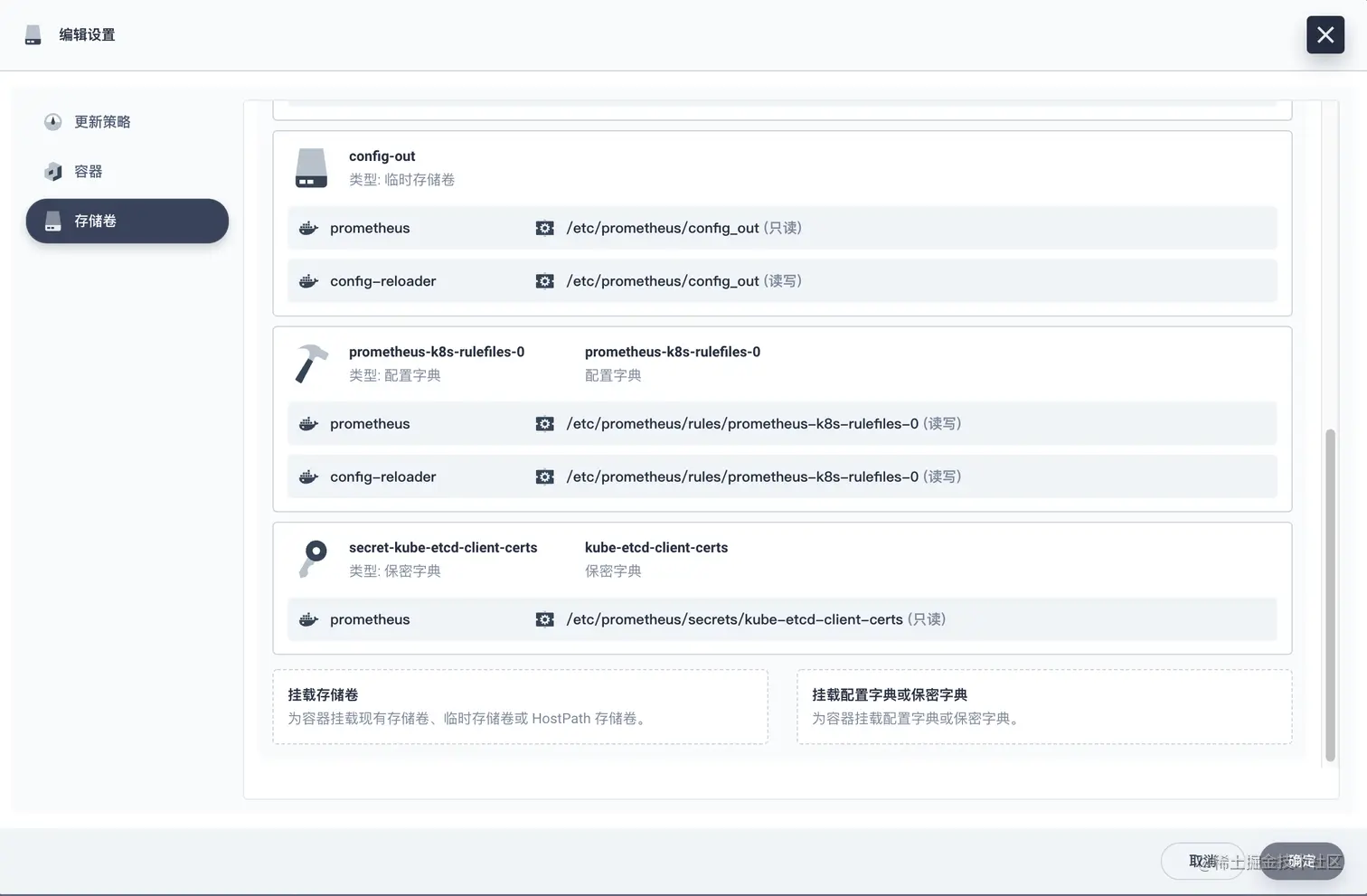 选择保密字典,只读挂载 kube-etcd-client-certs 到 /etc/prometheus/secrets/kube-etcd-client-certs,最终确定。