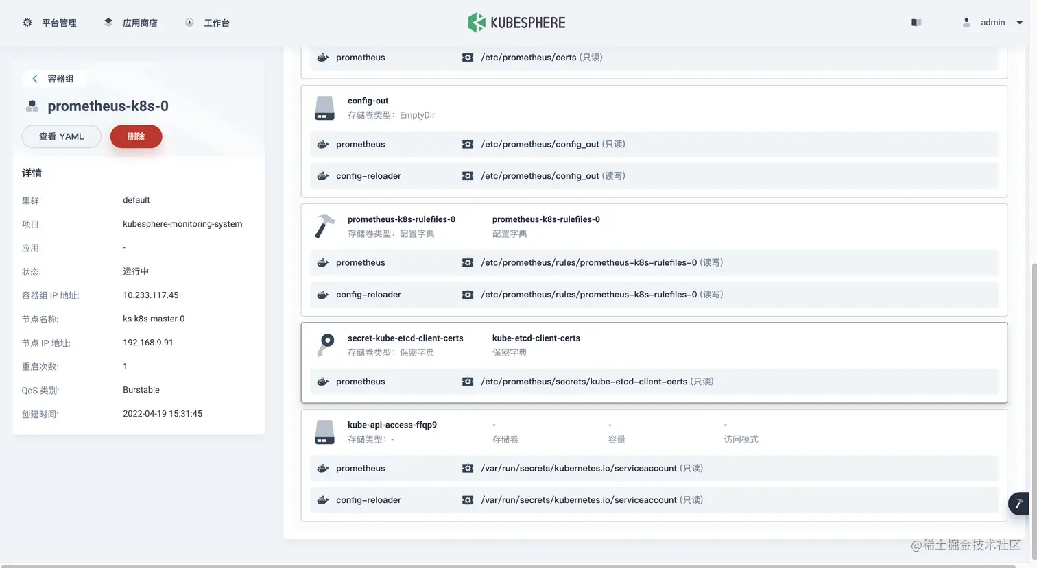 [root@ks-k8s-master-0 ~]# kubectl get secrets -n kubesphere-monitoring-system NAME TYPE DATA AGE additional-scrape-configs Opaque 1 9d alertmanager-main Opaque 1 9d alertmanager-main-generated Opaque 1 9d alertmanager-main-tls-assets Opaque 0 9d alertmanager-main-token-7b9xc kubernetes.io/service-account-token 3 9d default-token-tnxh7 kubernetes.io/service-account-token 3 9d kube-etcd-client-certs Opaque 3 9d kube-state-metrics-token-czbrg kubernetes.io/service-account-token 3 9d node-exporter-token-qrhl7 kubernetes.io/service-account-token 3 9d notification-manager-sa-token-lc6z4 kubernetes.io/service-account-token 3 9d notification-manager-webhook-server-cert kubernetes.io/tls 2 9d prometheus-k8s Opaque 1 9d prometheus-k8s-tls-assets Opaque 0 9d prometheus-k8s-token-7fk45 kubernetes.io/service-account-token 3 9d prometheus-operator-token-wlmcf kubernetes.io/service-account-token 3 9d sh.helm.release.v1.notification-manager.v1 helm.sh/release.v1 1 9d居然发现了 kube-etcd-client-certs。