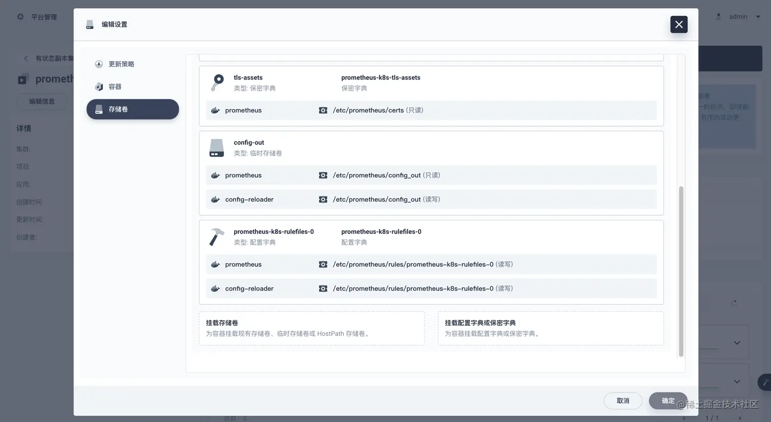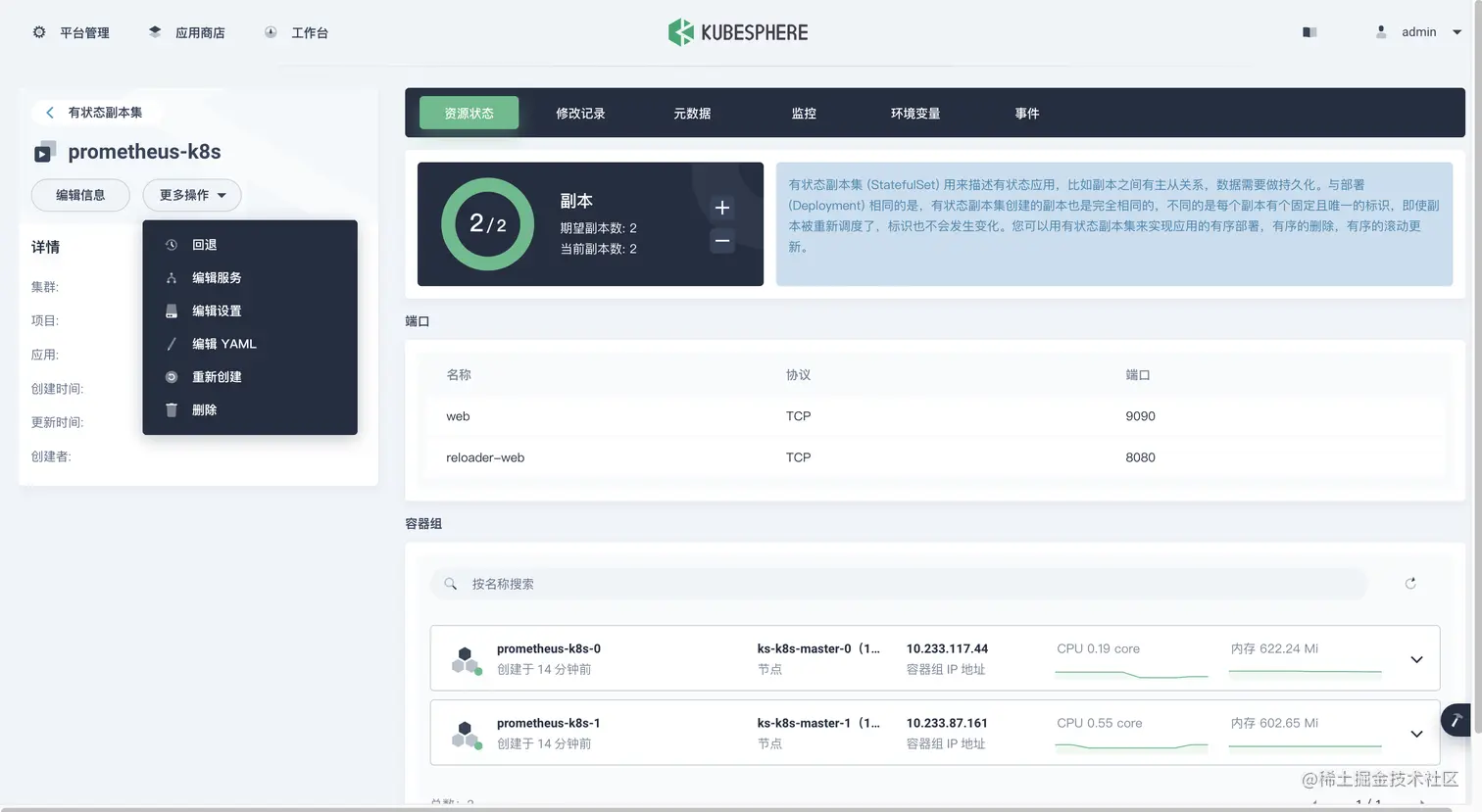 在控制台中,找到我们的有状态副本集 prometheus-k8s,点击更多操作->编辑设置。