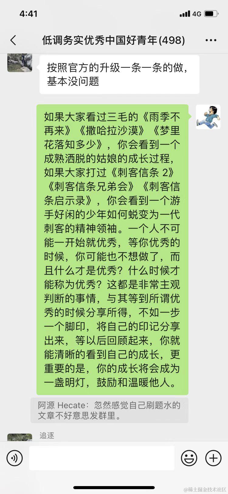 说这些,只是让大家对于我低调的习性有个基本的了解(虽然我感觉我已经没有那么低调了),正如我建的前端群的群名,「低调务实优秀中国好青年」,第一条就是低调,像我的群的知识库都是私密的,为了保护大家的隐私,各种活动统计也都是用的微信昵称,而非微信号。