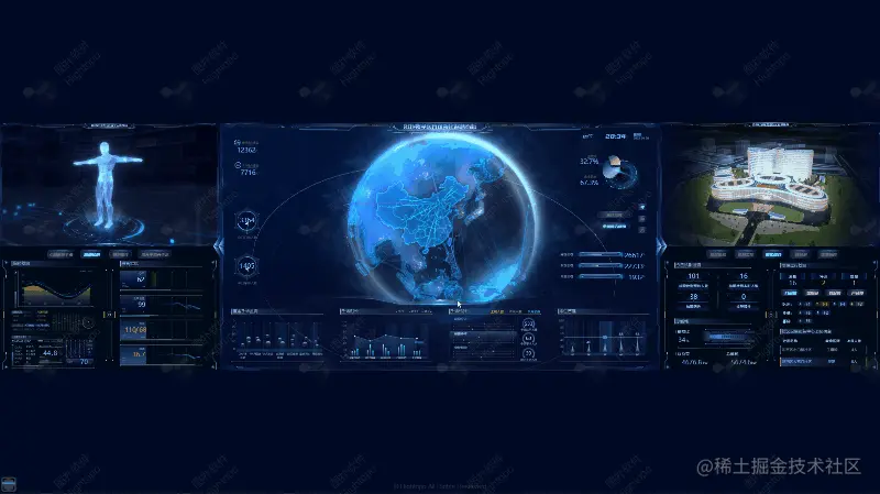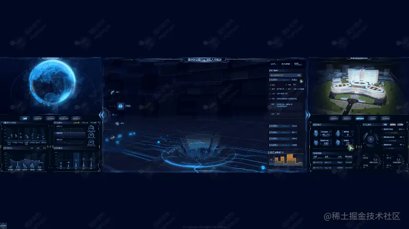 本次案例一改以往的一屏展示形式,通过三个大屏模块组合成为一个大长屏的方式呈现,中间为主大屏,两边为副屏,每个大屏模块独立且融合,可通过 HT 自带交互左右任意切换场景,实现三个模块场景的旋转、平移、拉近拉远操作以及 360 度全方位无死角浏览。