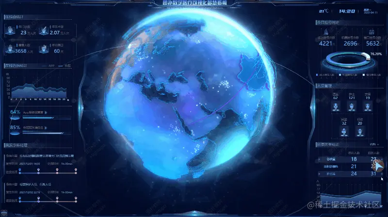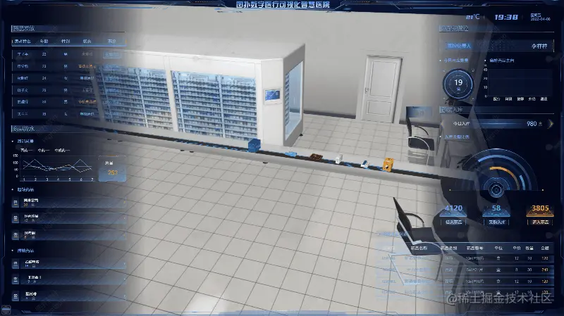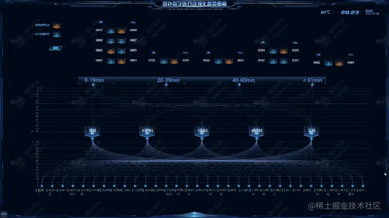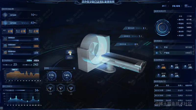 图扑将 HUD 结合至医疗的数据可视化中,引用其思路,对科室的手术时间,手术台数、房间使用状态、房间闲置状态进行线条形式的展示,辅以 2D 面板将手术总手术量、手术情况、设备巡检、巡检维护数量以及巡检次数、维护率等数据进行展示。