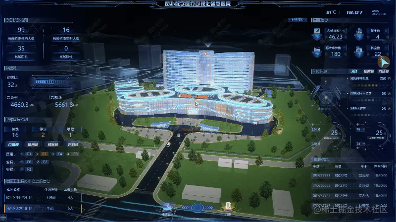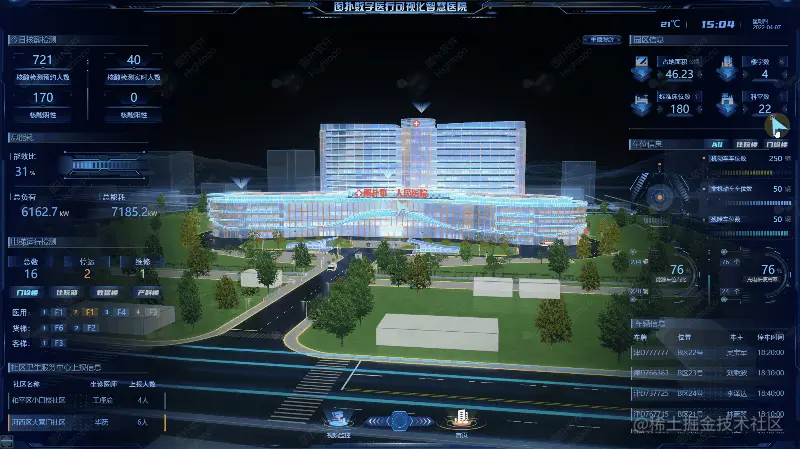 界面初始化后,案例主场景由线框楼宇逐渐向写实场景过渡,整体设计以写实风格为主基调,通过对医院内建筑、道路等进行三维建模,结合丰富的 2D、3D 组态,仿真还原了数字化医院整体效果与数据展现。利用图扑软件(Hightopo)自主研发的引擎渲染,让场景在 Web 中高效流畅地加载运行以及保证场景优秀的可视化效果。