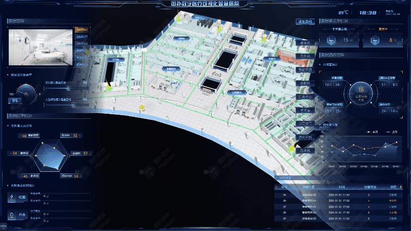 图扑软件(Hightopo)数据可视化助力医院在集中监控、辅助决策、安防管理、业务联动等多层面,构建感知、融合、分析、决策、执行、安全的统一管理,提升医院现代化管理水平和品牌服务形象。以优质、安全、便利的诊疗方式,实现医疗资源下沉,逐步形成医疗、服务、管理一体化的智慧医院系统。