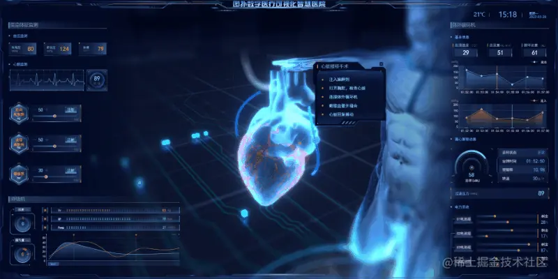 以冠状动脉旁路移植手术(心脏搭桥手术)为例,心脏三维可视化手术形式可避免以往凭借经验来完成复杂的手术定位。将接收到的心脏超声图像和探头姿态数据进行分析处理,再通过 HT 可视化图像显示获取到的病灶靶点位置关系,医护可通过大屏对画面进行任意缩放、平移、旋转,多时间、全方位、透明化的观察病灶位置、大小、形态及手术详细记录。2D 面板则同步呈现患者的血压心跳、注射针剂及呼吸机、体外循环机、离心泵辅助器所监测到的浓度、血液温度、血流量或设备运作功率等。