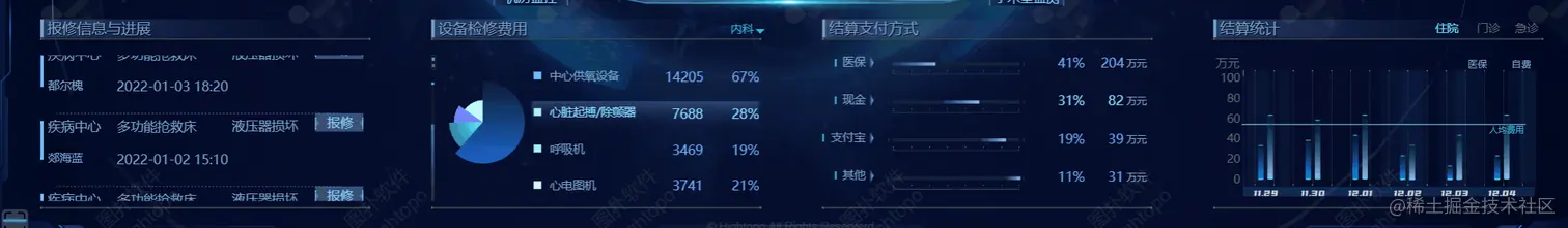 医疗设备不断提高医学科学技术水平的基本条件,也是现代化程度的重要标志,医疗设备已成为现代医疗的一个重要领域。可接入医疗数据库,通过 HT 可视化面板对全球以及本市的输入患者,对今日门诊、急诊人数进行实时展示。对园区内不同区域的设备保修信息与进展进行实时汇总统计,以便运维人员可以更加快速了解设备维修情况。让设备管理人员对不同科室的设备检修费用进行统计管理。对结算的支付方式以及结算统计也进行相应的展示。