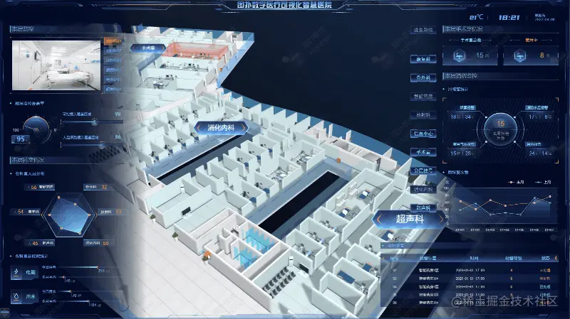 HT 2D 可与 3D 在三维空间无缝融合复用素材资源,点击右侧面板的科室可切换至相对应的科室,对不同科室的环境信息、科室情况、以及科室的具体不同信息都可通过面板进行展示,让医院运维人员更智慧化管理。