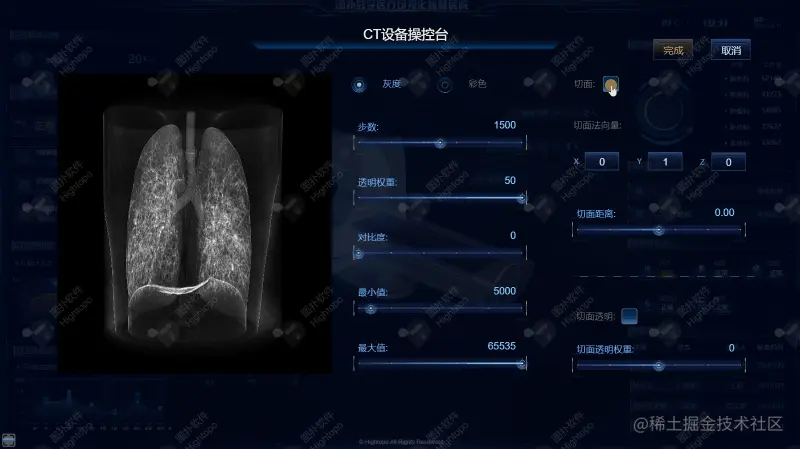 HT 是基于 HTML5 的 2D、3D 图形渲染引擎,有着丰富的展示形式和效果,案例中我们搭建了 CT 检查时的三维动画演示以及 CT 控制台的操作设置场景。通过 HT 可视化让用户更加直观清晰了解检查的画面场景,也可以利用 HT 来控制 CT 检查时的颜色、切面等信息调整问题。