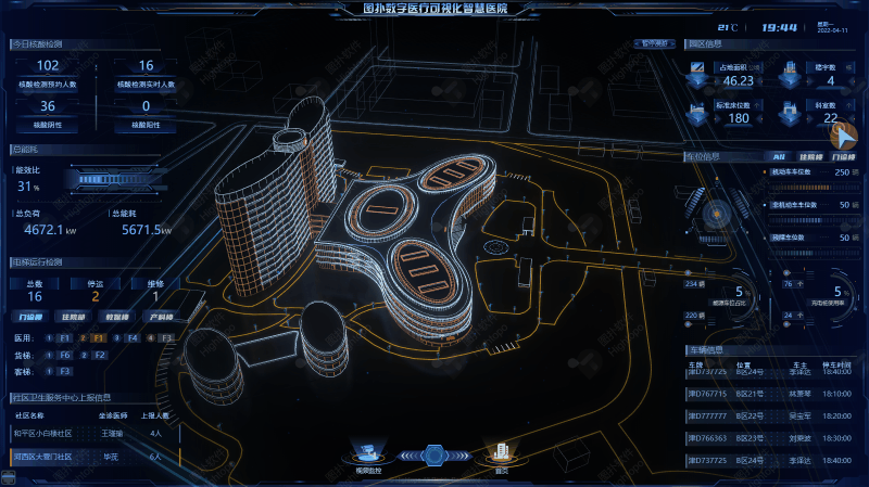 将 HT 可视化与园区管理系统相结合,接入园区管理数据至可视化平台,实时更新园区内占地面积、楼宇数、标准床位数及科室数等信息以及院内人员在社区卫生服务中心的坐诊情况。社区医疗服务系统,可提供一般疾病的基本治疗,慢性病的社区护理,大病向上转诊,接收恢复转诊的服务。