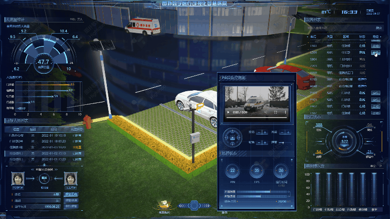 医院作为公众场所,人员复杂,虽然有园区巡逻安保设置,但是无法达到全园区实时覆盖及 24 小时不间断巡视,通过结合可视化即可实现全天全方位实时监测,对全天各时段人流量进行统计汇总、对园区内各区域的可疑人员进行实时信息抓取、并通过结合城市安保系统对可疑人员进行信息的提取对比与监测管理,赋予管理者对园区安保工作进行流程化、制度化、全局化的数字管理,保证园区内人员的生命财产安全。