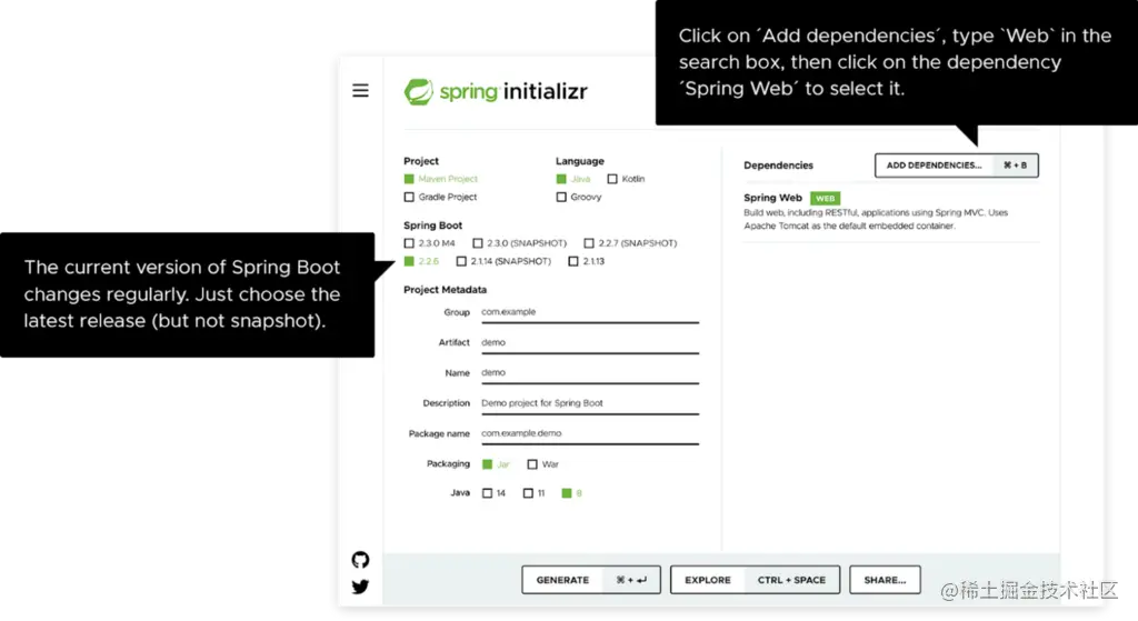 第一步是设置一个Spring Boot应用程序。从 Spring Initializr 网络应用程序开始,执行以下步骤。