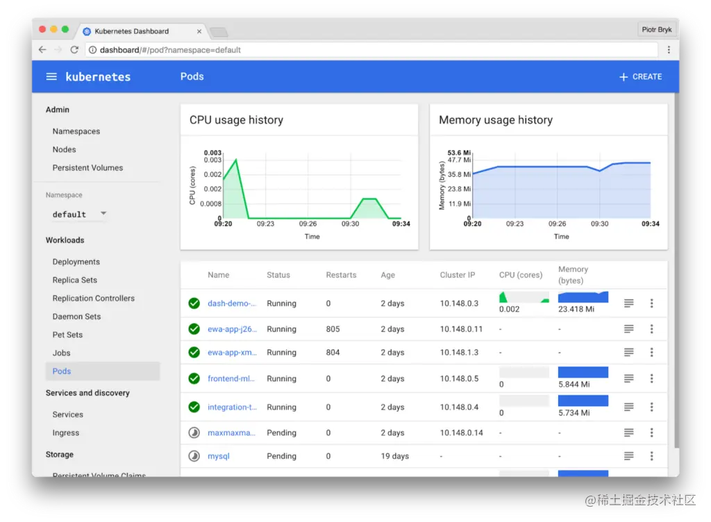 之后,你也可以使用Kubernetes仪表盘,你会看到以下图片