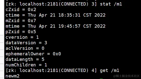 下面的get我们可以获取该节点对应的值,比如我存了个“/m1”,查出来就是newm2