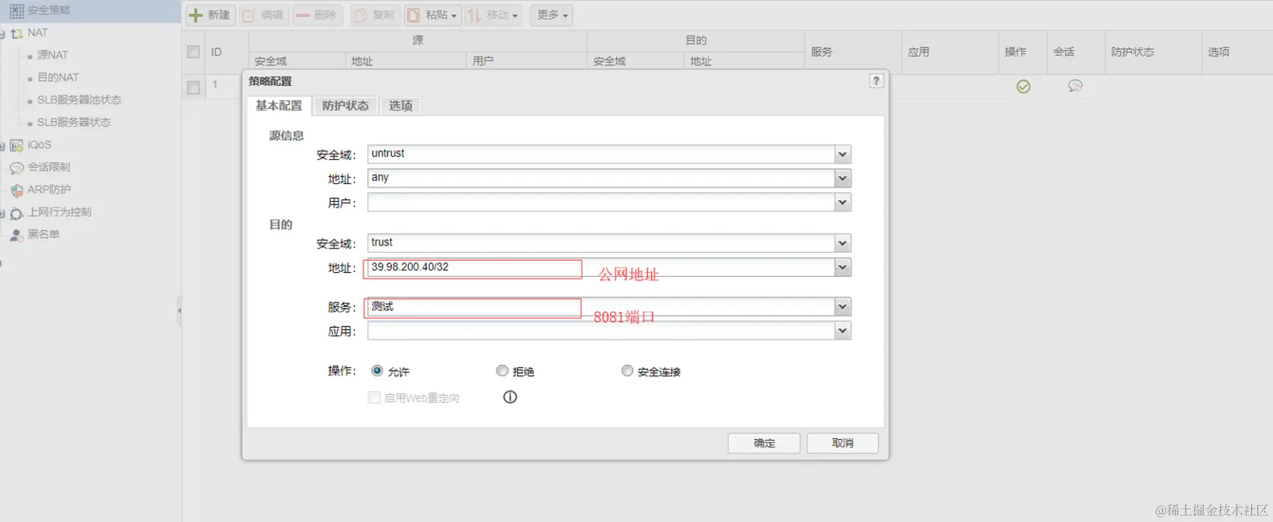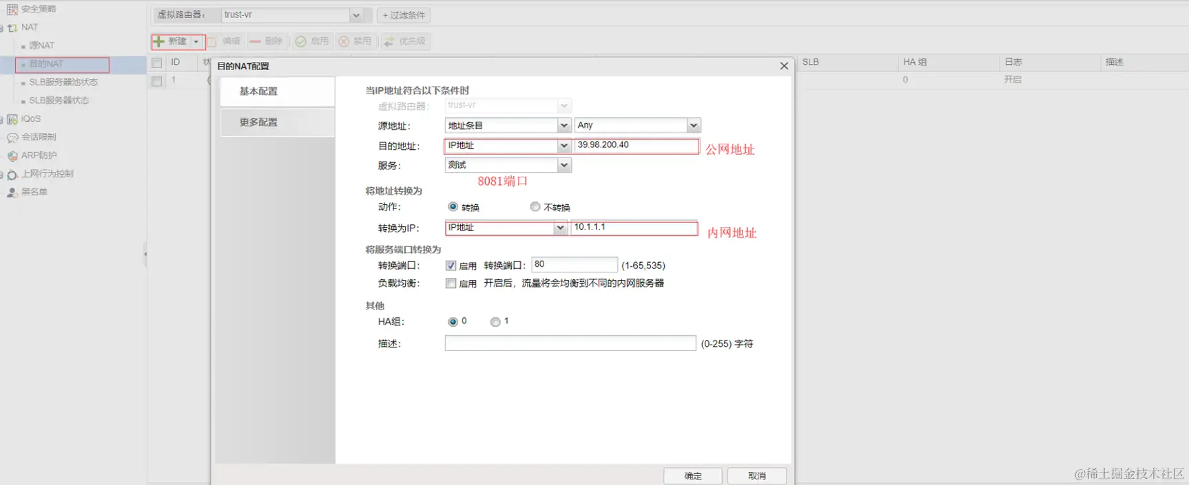 - 外网通过设备公网 IP 39.98.200.40:8081访问内网地址的 10.1.1.1 的 HTTP 80服务。