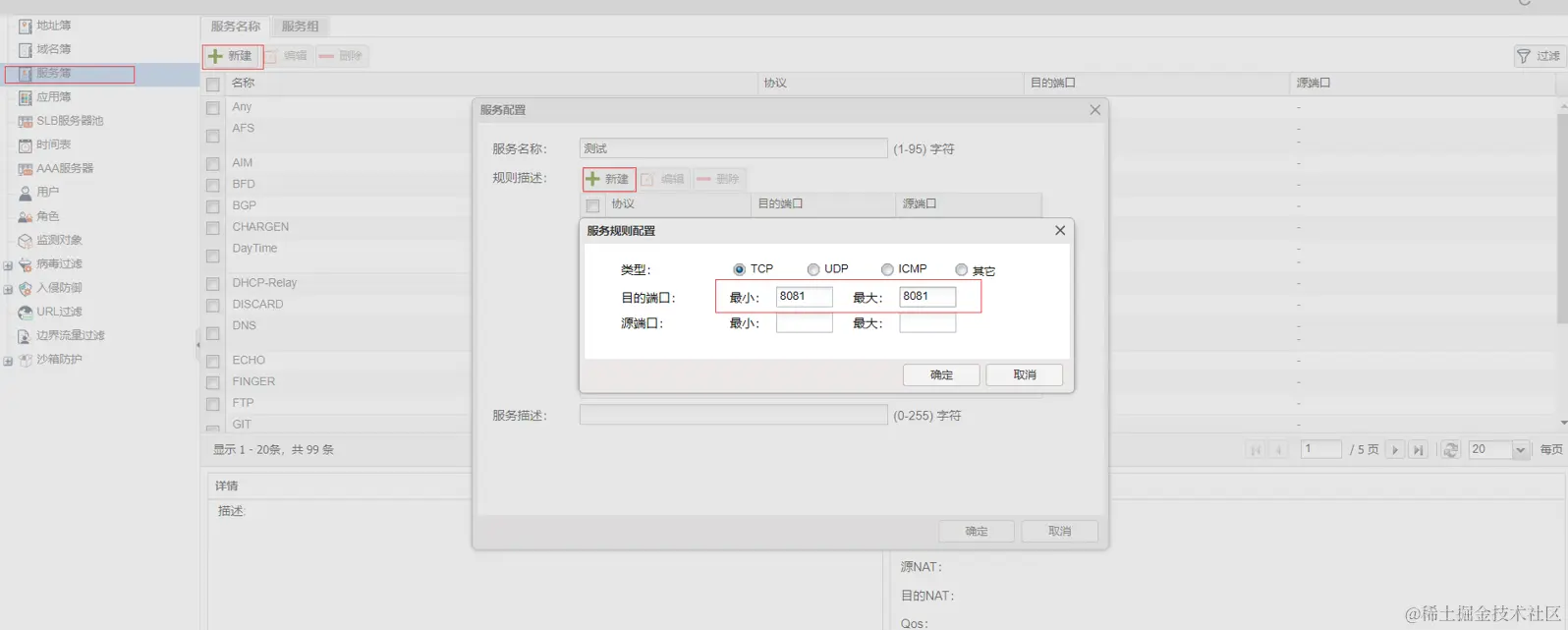 注:目的端口为固定端口时,配置最小和最大一致,连续范围端口可以配置一个区间。在没有指定源端口的情况下,不用填写源端口,如果配置,会导致DNAT不匹配。(因一般源端口是随机,目的端口固定)
