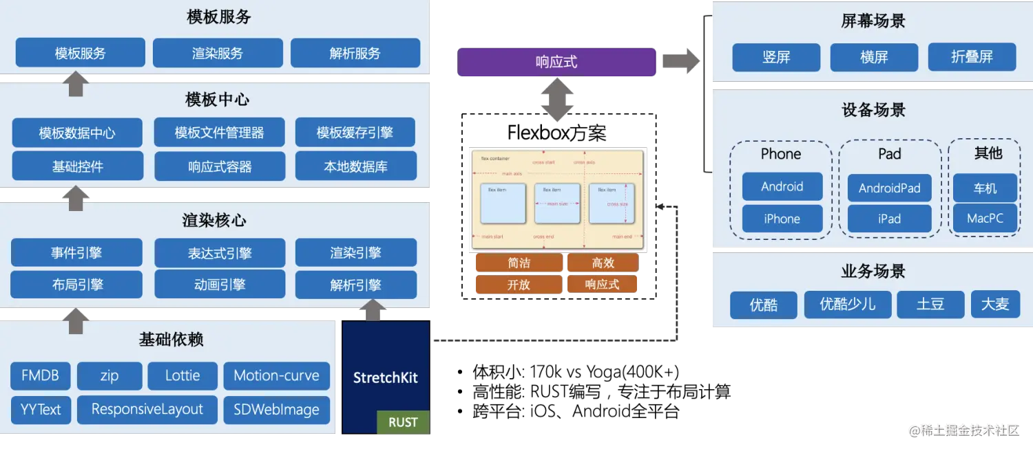 按照分层设计理念共分为4层。基础依赖层坚持最小依赖原则,要重点说明的是,为了保证模板布局计算的高性能,我们引入了由RUST编写的StretchKit高性能布局计算引擎[github.com/vislyhq/str…