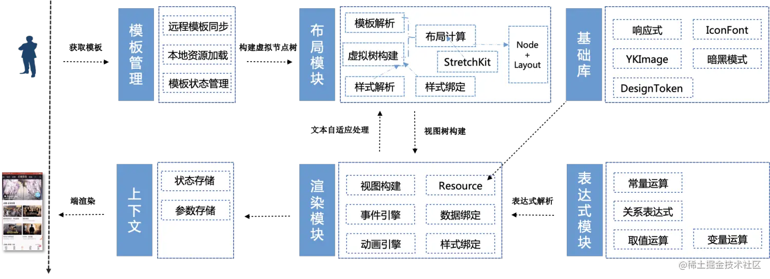 对于动态模板引擎来说,输入结构化的模板文件,经过文件IO、数据解析、虚拟节点树构建、布局计算、表达式运算、渲染树构建到真实视图树组成了完整的总线链路。