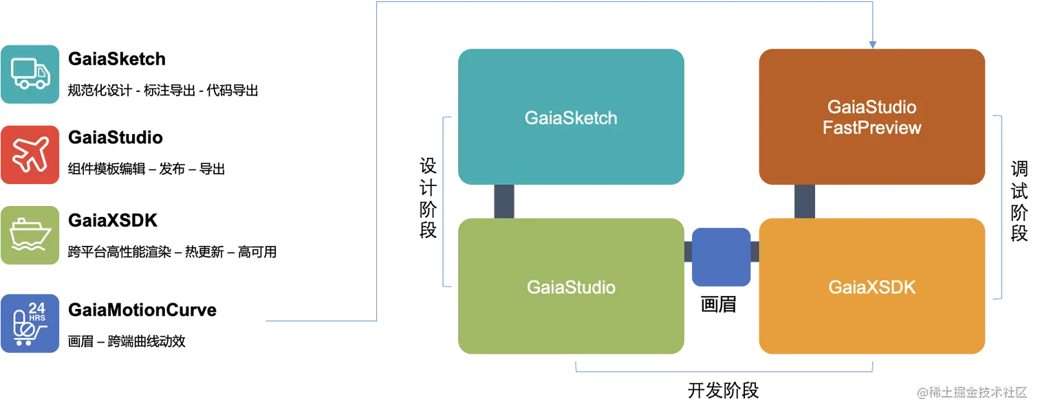 动态模板技术体系以跨端动态化SDK为中心,通过在设计阶段、研发阶段、联调阶段降低对接、开发、调试等核心工作的技术成本,从而真正实现研发提效。目前整个技术方案包括画眉跨平台动效解决方案、智能化设计平台GaiaSketch、跨端模板动态化方案GaiaX、动态模板可视化少代码搭建平台GaiaStudio、辅助调试工具快速预览FastPreview。