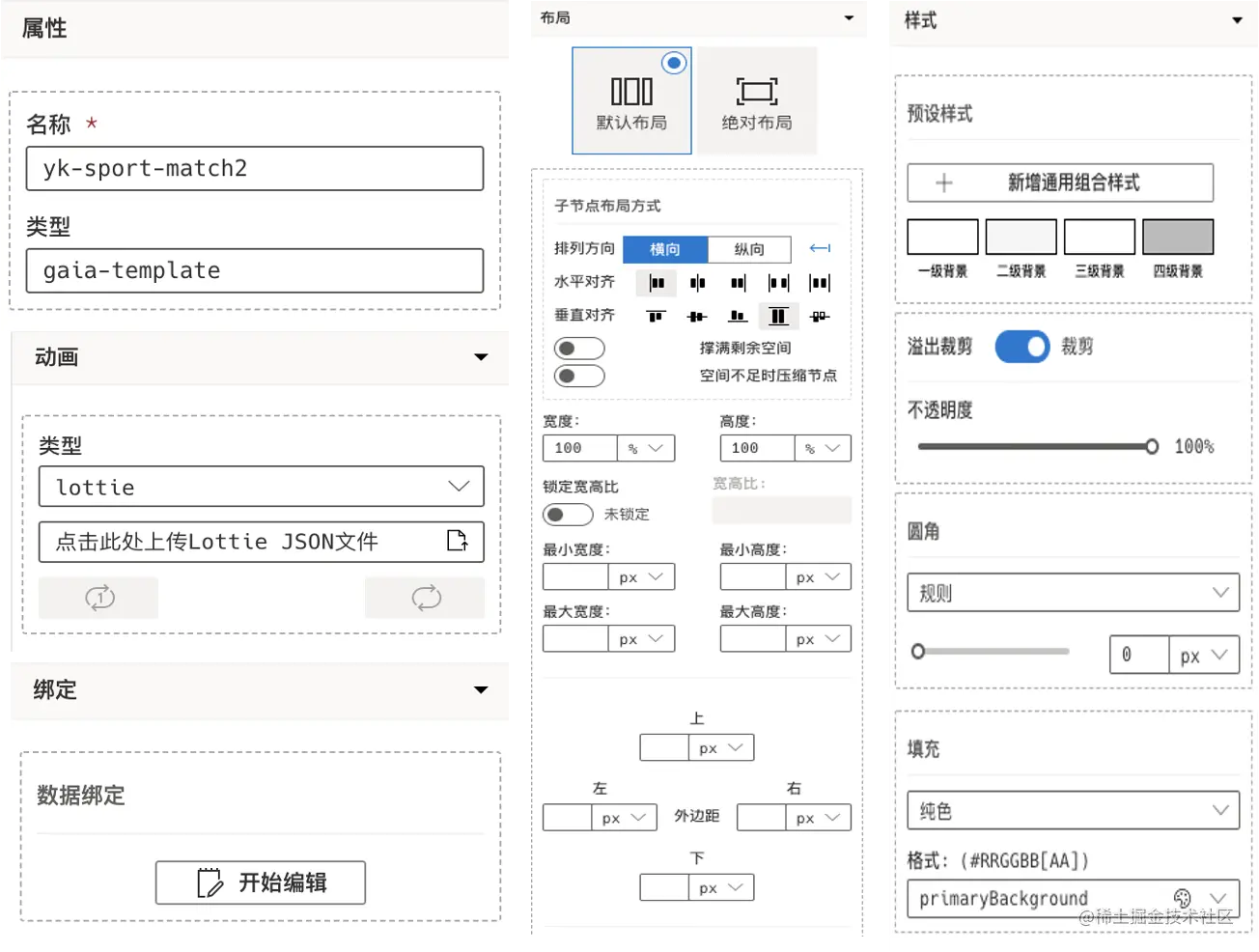 为了解决上述问题,优酷技术团队在动态模板引擎上线后,着手构建了GaiaStudio动态模板低代码IDE。开发者通过该IDE,可以对模板进行可视化搭建,引擎支持的所有布局及样式属性,都在IDE中进行了内置,开发者只需进行选择,便可用户界面中即可得到渲染反馈。