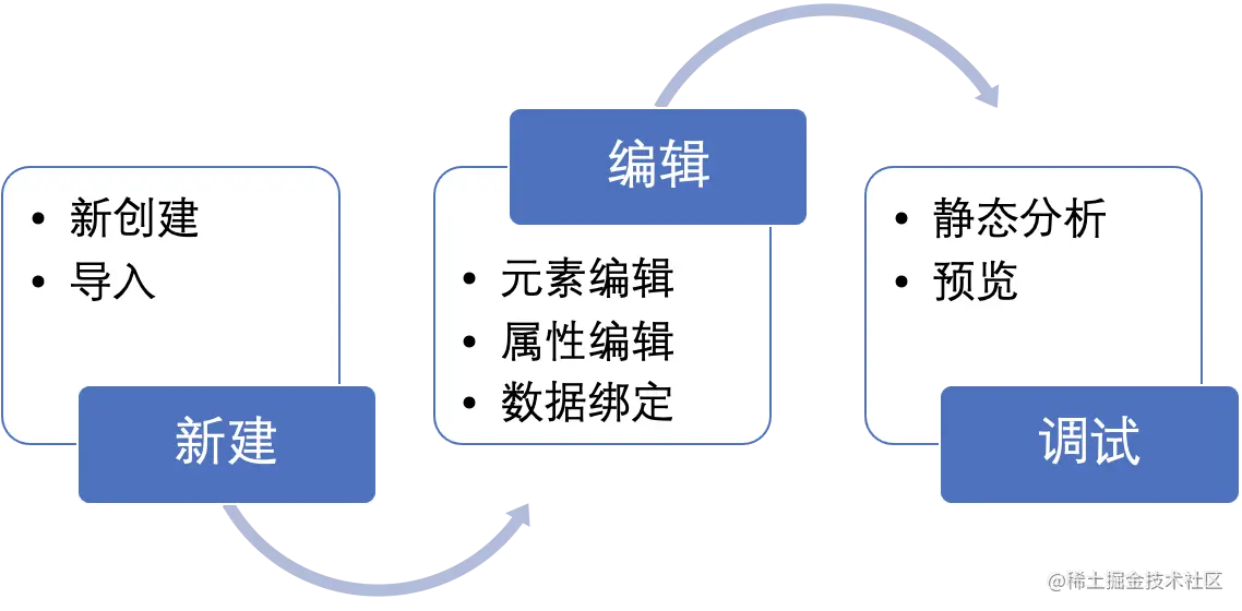 对于一个模板,一般来说我们要进行一组完整的编辑处理,才能完成整个构建工作,包括:基础属性、布局、样式、动画、数据绑定。