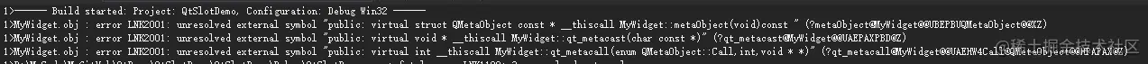 会在MyWidget.h同目录下生成moc_MyWidget.cpp文件,将此文件添加到工程中,重新编译就能成功。