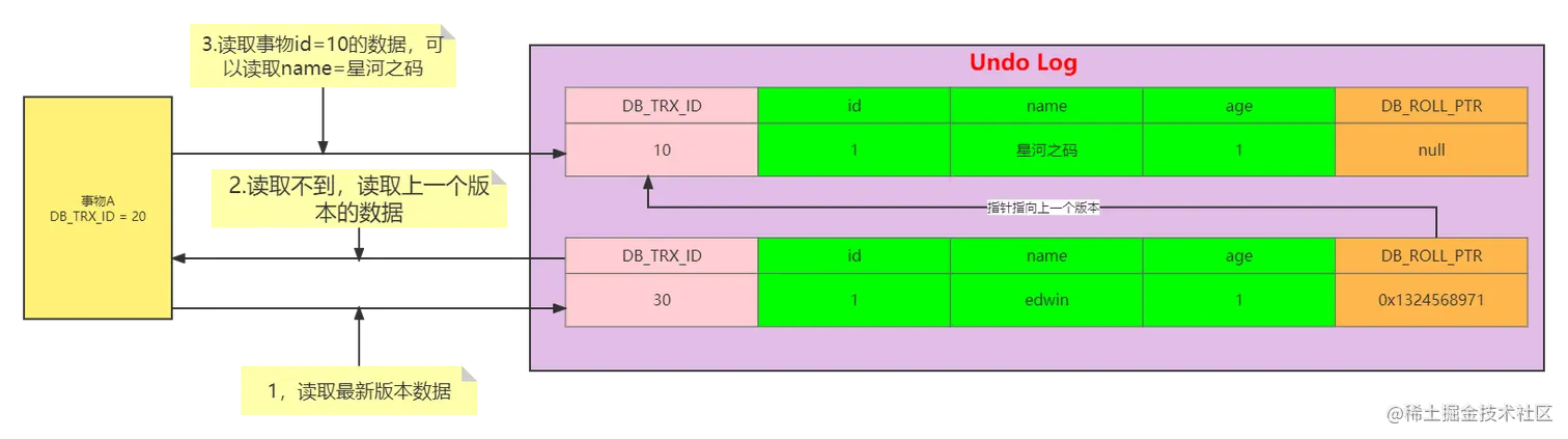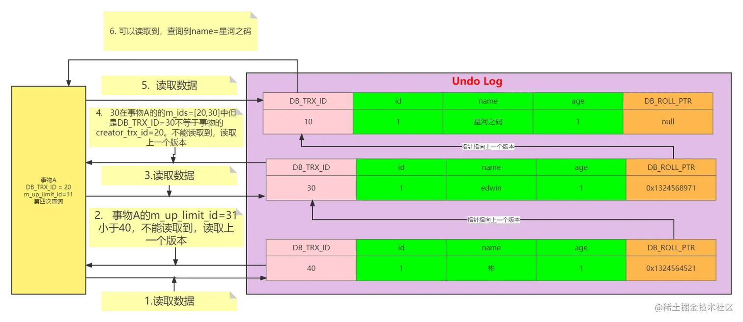 此时由于事物A,由于事物A的m_up_limit_id=31,而日志中的DB_TRX_ID=40,根据可见性判断规则可以知到,事物A不能读取到DB_TRX_ID=40的记录,按照版本链的DB_POLL_PTR继续往上找,找到DB_TRX_ID=30的记录,虽然30在事物A的的m_ids=[20,30],但是DB_TRX_ID=30不等于事物A的creator_trx_id=20,所以还是不能读取,继续往上找,最终读取到了DB_TRX_ID=10的记录,name=星河之码