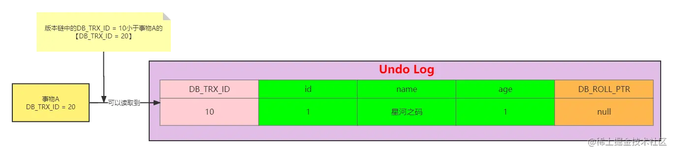 日志事务Id【DB_TRX_ID = 10】 < 最小活跃事务ID【m_low_limit_id=20】,因此可以读取到DB_TRX_ID = 10这条版本链中的数据。即name = 星河之码。