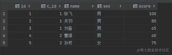 insert into student(id,c_id,name,sex,score) value(6,2,'吕布','男',89);