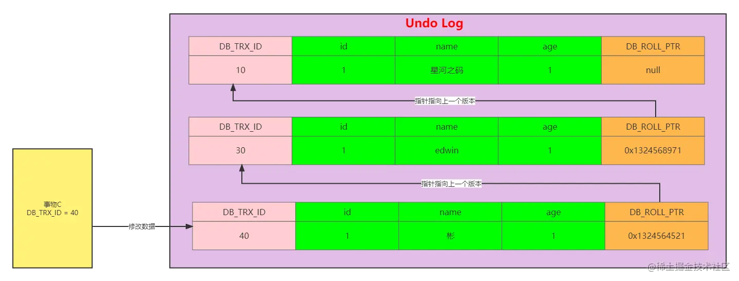 表示在当前事务【creator_trx_id】开启以后,有新的事务开启,并且新的事务修改了这行数据的值并提交了事务,因为这是【creator_trx_id】后面的事务修改提交的数据,所以当前事务【creator_trx_id】是不能读取到的。